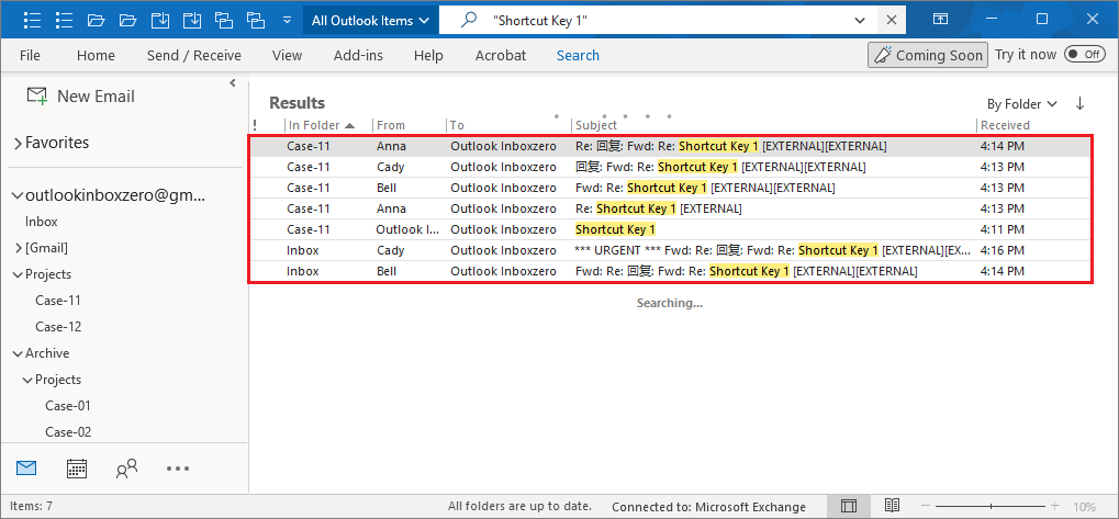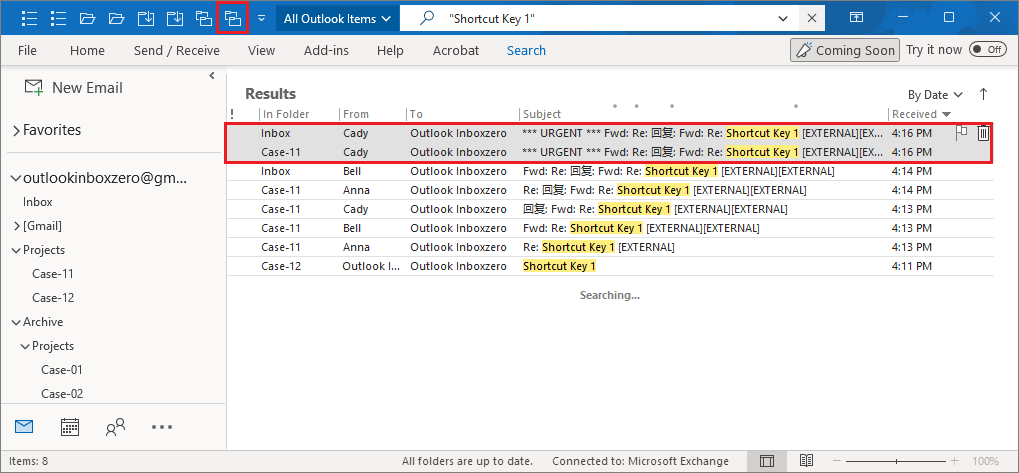 3. Add-in found all related emails with subject ("Shortcut Key").