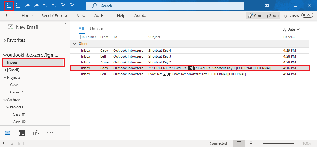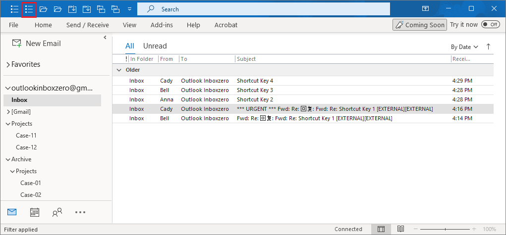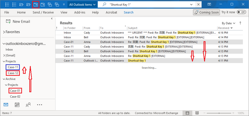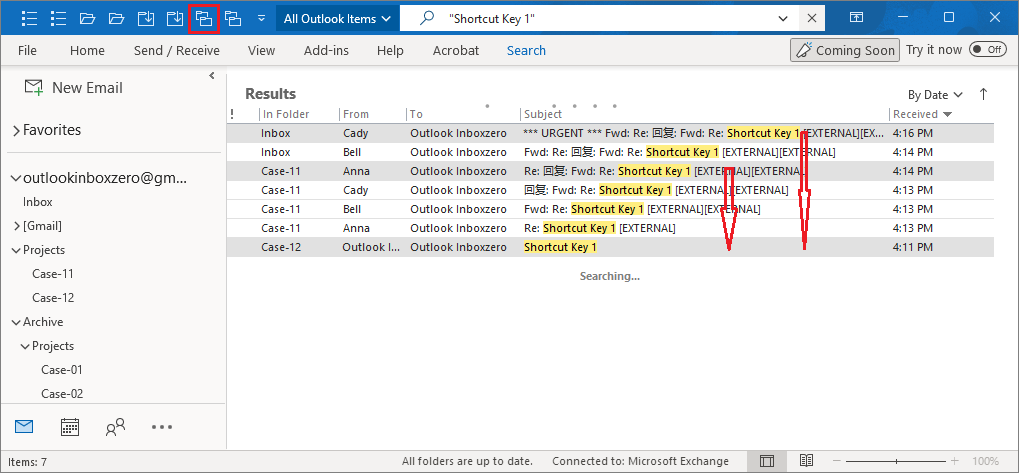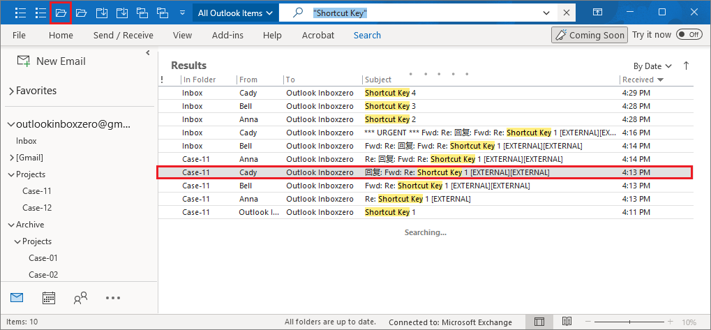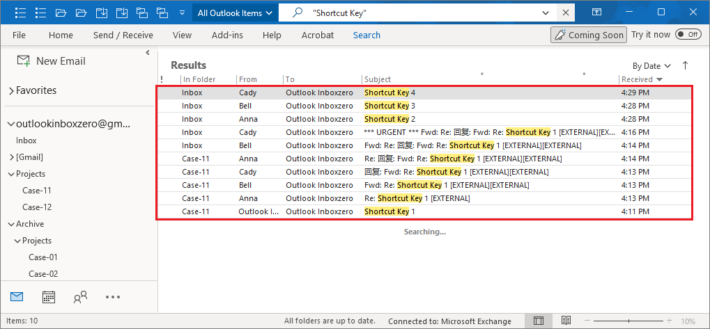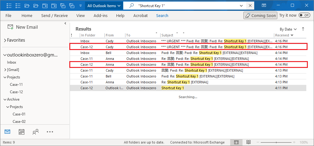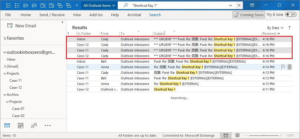 3. Add-in found all related emails with subject ("Shortcut Key").