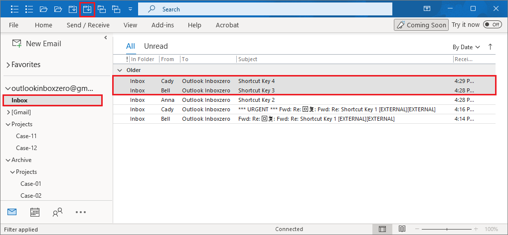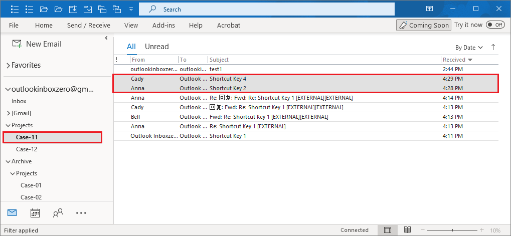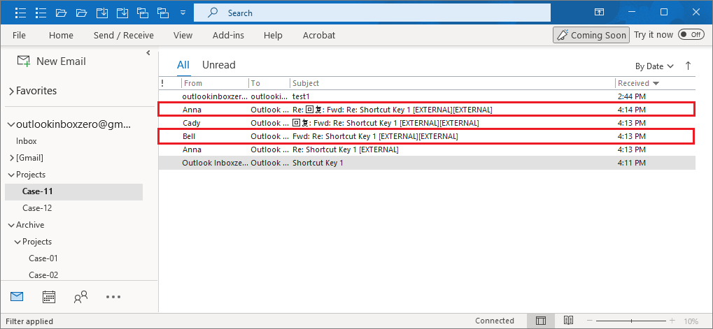3. Add-in found all related emails with subject ("Shortcut Key 1").